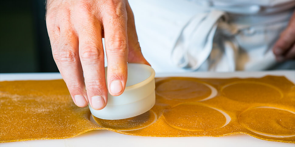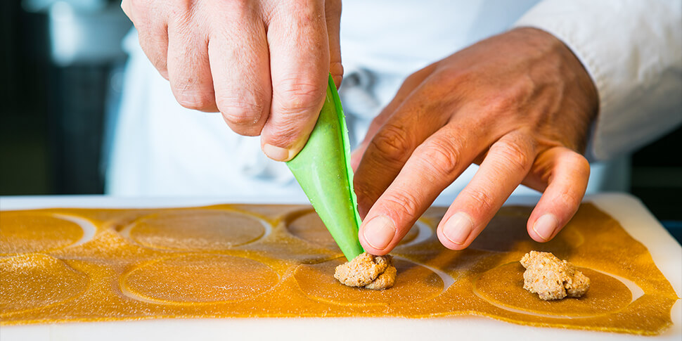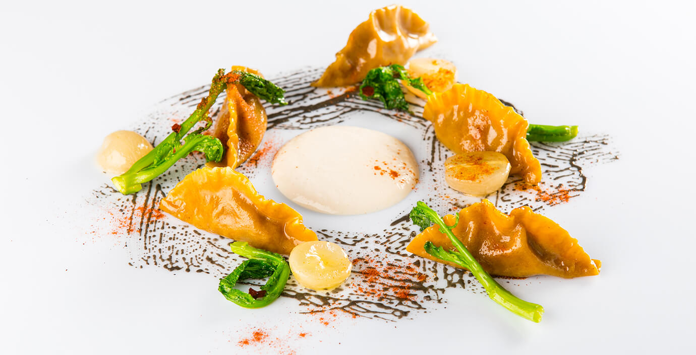 La pasta ripiena… la mia passione! Cerco sempre di trovare il giusto equilibrio e da quando viaggio in India vado sempre più di spezia. Infatti, assaggiando i loro stufati di carne ho capito che non bisogna avere timore perché in una preparazione possono convivere molte più spezie di quanto pensiamo. Mi sono divertito a rendere tutto più rotondo, creando una salsa di mandorle pura che funge da traino per tirare fuori il massimo da una paprika, dal lato piccante fino a quello aromatico. Il lato grasso della mandorla dona, infatti, equilibrio alle spezie piccanti. Se poi aggiungiamo il sentore dei funghi, l’erbaceo dei broccoletti, la nota di olive e di sesamo nero il gioco di sapori vi coinvolgerà tutto il palato.