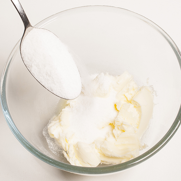 In una ciotola mescolare il burro morbido con lo zucchero.