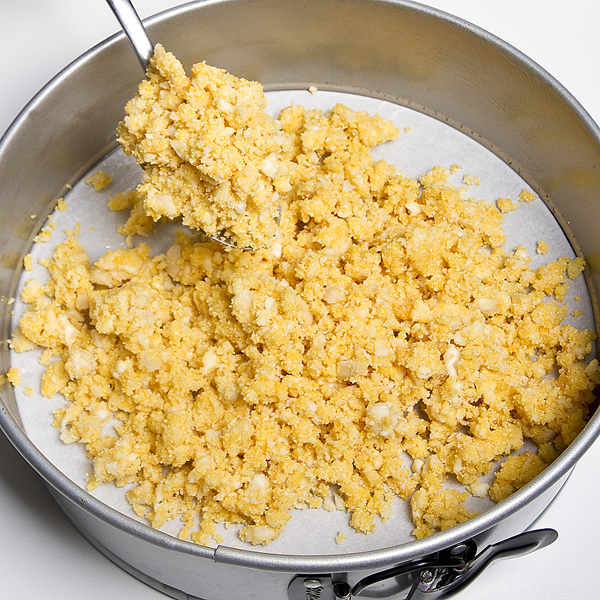 Distribuire l’impasto sbriciolandolo senza schiacciarlo, con uno spessore massimo di 2 cm.