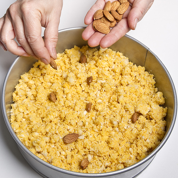 Decorare la sbrisolona con le mandorle. Cuocere in forno a 190° per 30 min. Sfornare e lasciare raffreddare.