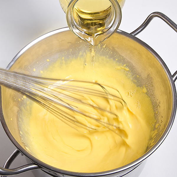 Zabaione: porre lo zucchero e i tuorli in una casseruola. Sbattere il composto e incorporare la fecola di patate.