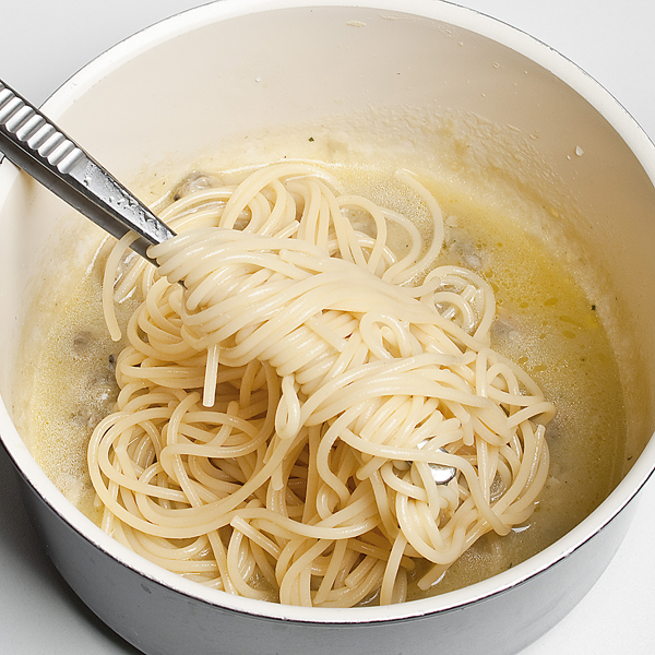 Cuocere gli spaghetti in abbondante acqua salata, scolarli al dente e passarli in tegame con le vongole.