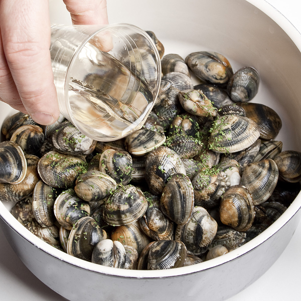 Aggiungere il prezzemolo in foglie CANNAMELA, le vongole scolate e il vino bianco.