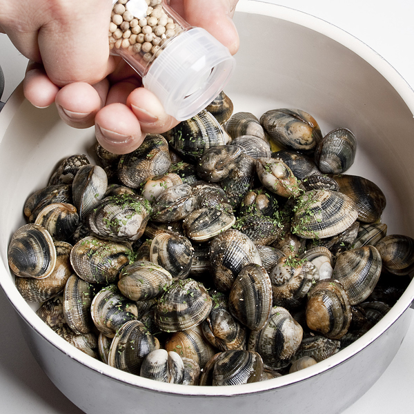 Porre le vongole a spurgare per qualche ora in acqua con due cucchiai di sale grosso, avendo cura di cambiare l’acqua per due o tre volte.