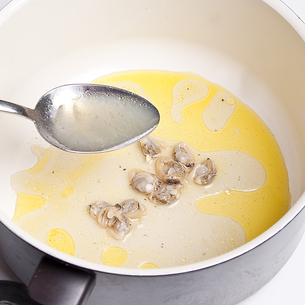 In una casseruola soffriggere un pizzico di aglio macinato CANNAMELA con 2 cucchiai di olio, poi aggiungere le vongole sgusciate e il fondo di cottura.