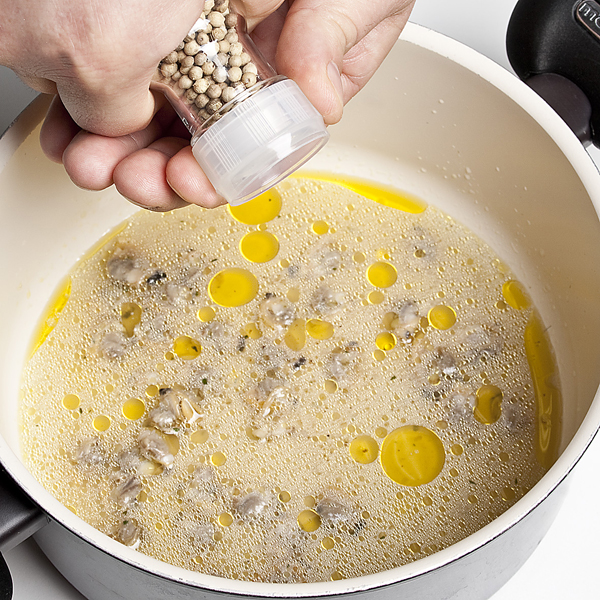 Allontanate dal calore, lasciare intiepidire i molluschi e sgusciarne la metà. Filtrare il fondo di cottura.