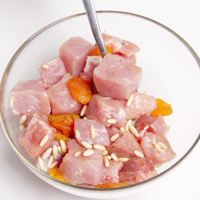 Completare con l’olio, le albicocche secche, il sale e i pinoli.
