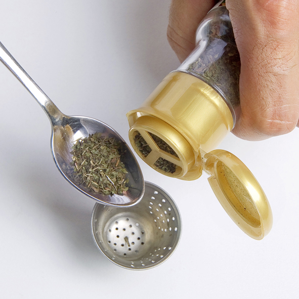 Ponete 2 cucchiaini di menta in foglie CANNAMELA nell’apposito infusore per thé e chiudetelo.