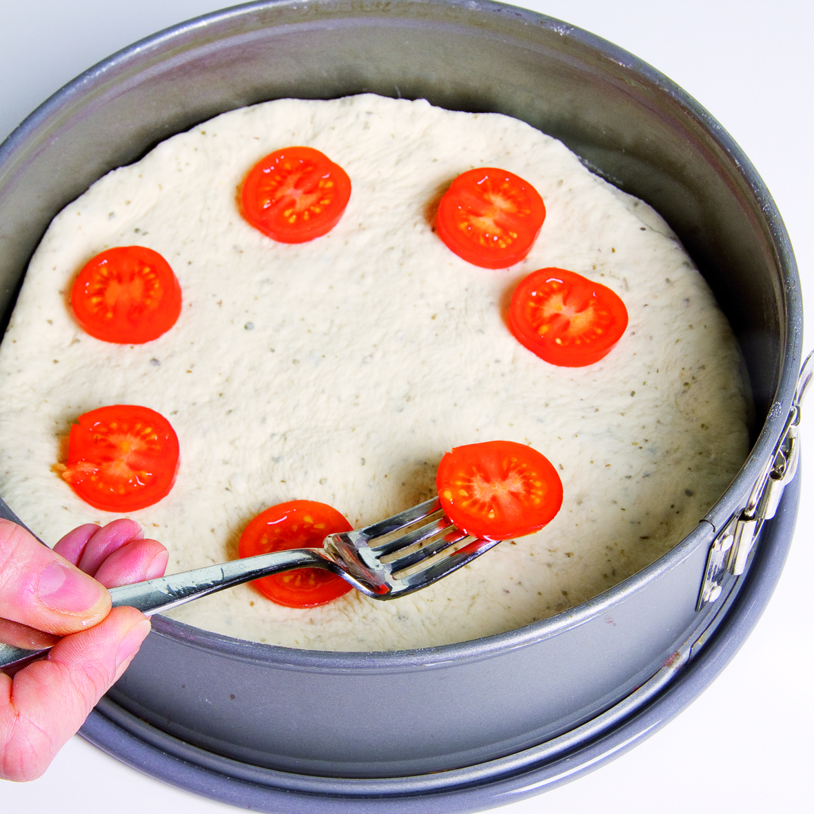 Disporre in superficie le fettine di pomodorini, pennellare con 1 cucchiaio di olio mescolato a 2 cucchiai di acqua e lasciare lievitare per altri 30/35 min.