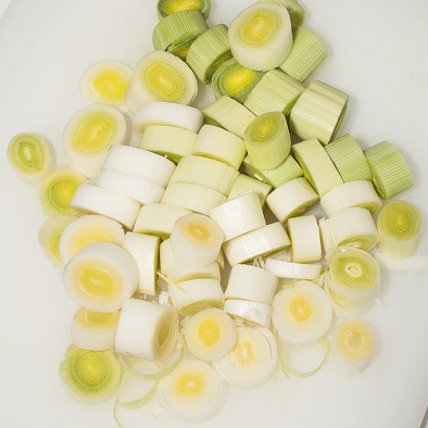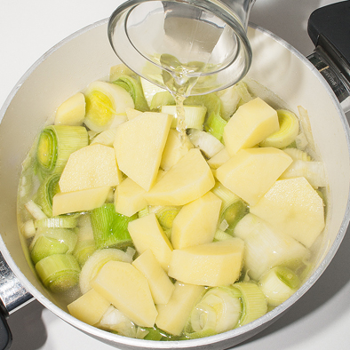 Tagliare a tocchi le patate e a rondelle il porro.