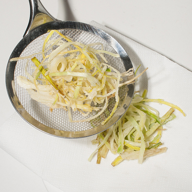 Friggere il porro in olio caldo, scolare su carta da cucina e salare.